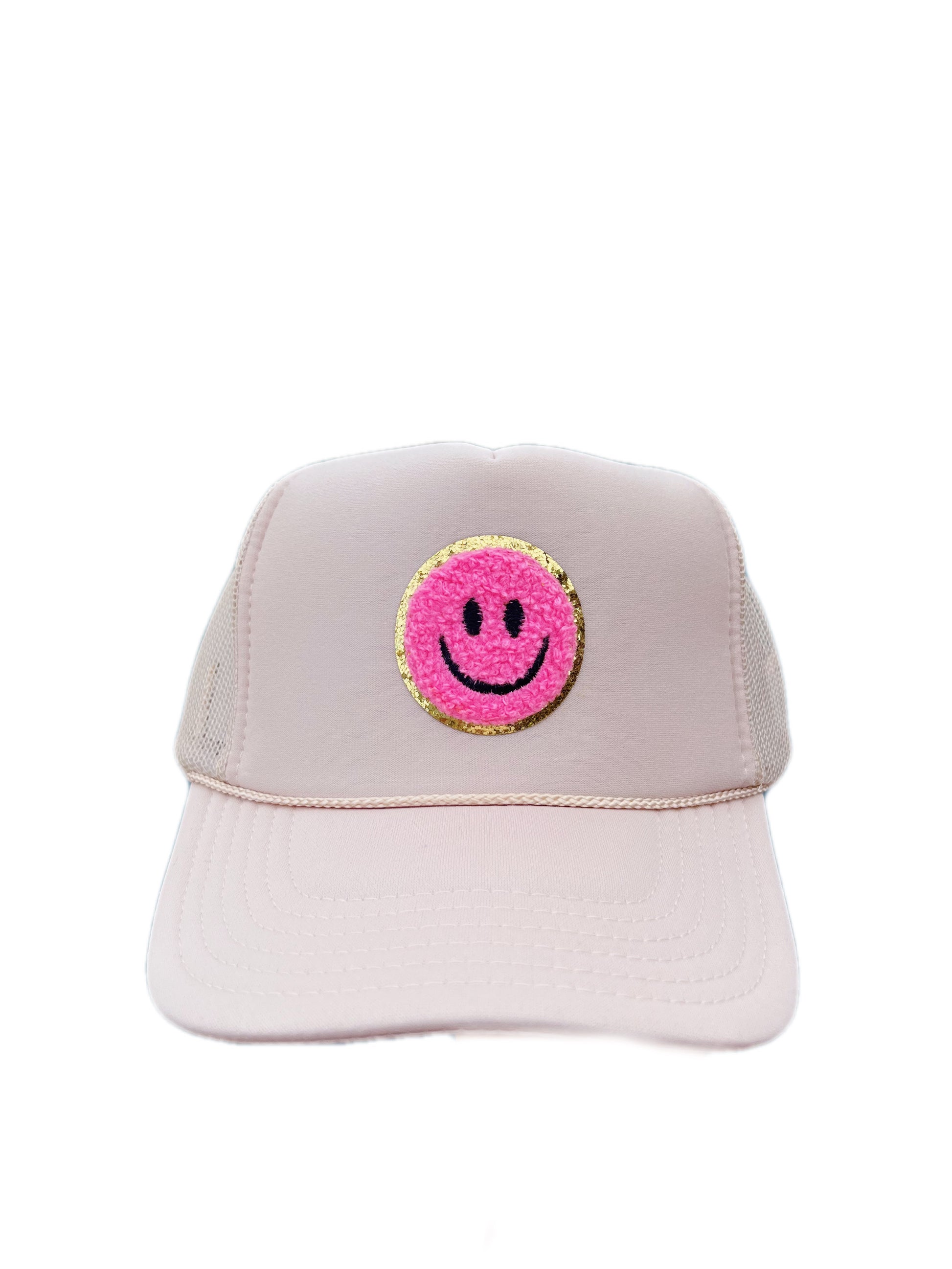 TAN TRUCKER HAT WITH HOT PINK SMALL SMILEY FACE ☻